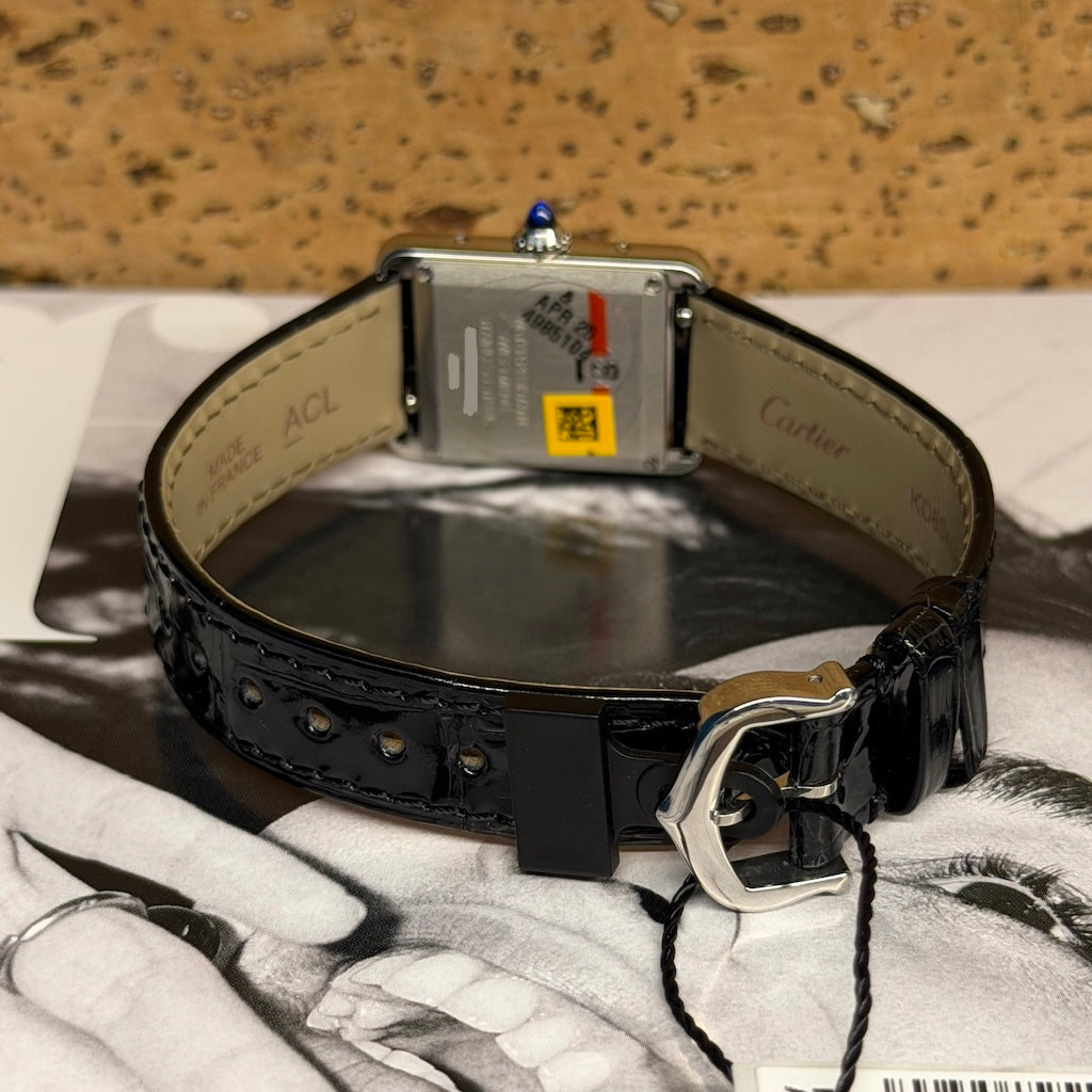 The stainless steel case, measuring 33.7 mm x 25.5 mm, features the classic Tank silhouette — rectangular, elegant, and defined by clean lines that have remained iconic for over a century. The polished finish and gently curved lugs ensure a comfortable and refined wrist presence, suitable for both men and women.