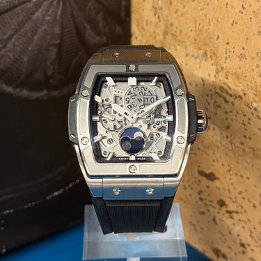 Housed in a 42mm tonneau-shaped case crafted from lightweight satin-finished titanium, this model embodies the modern spirit of Hublot’s design language. The openworked skeleton dial reveals the intricate mechanics of the automatic HUB1770 chronograph movement, delivering a 50-hour power reserve and high-performance functionality.