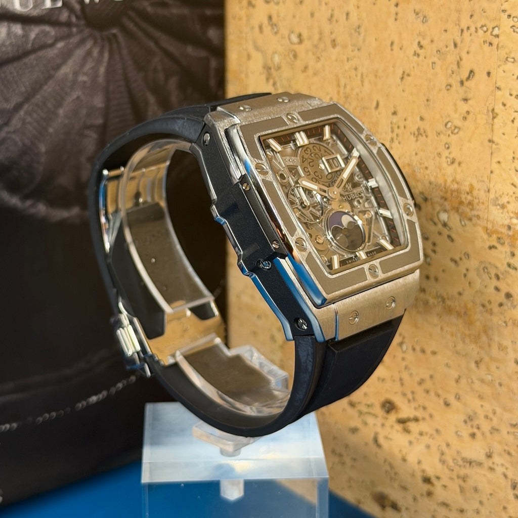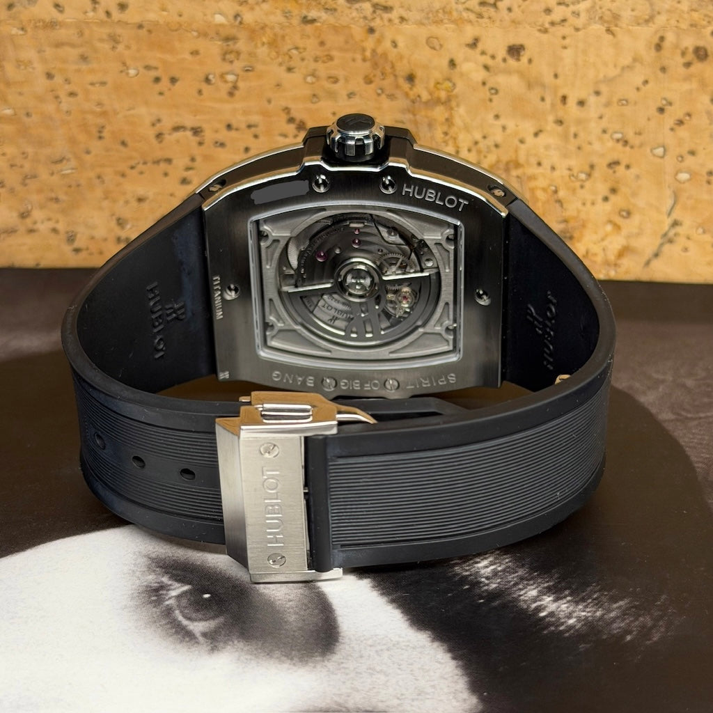 The watch features a black structured rubber strap with a titanium deployant buckle, offering both comfort and a sporty edge. The transparent case back allows a full view of the beautifully finished movement, showcasing Hublot’s fusion of tradition and cutting-edge engineering.