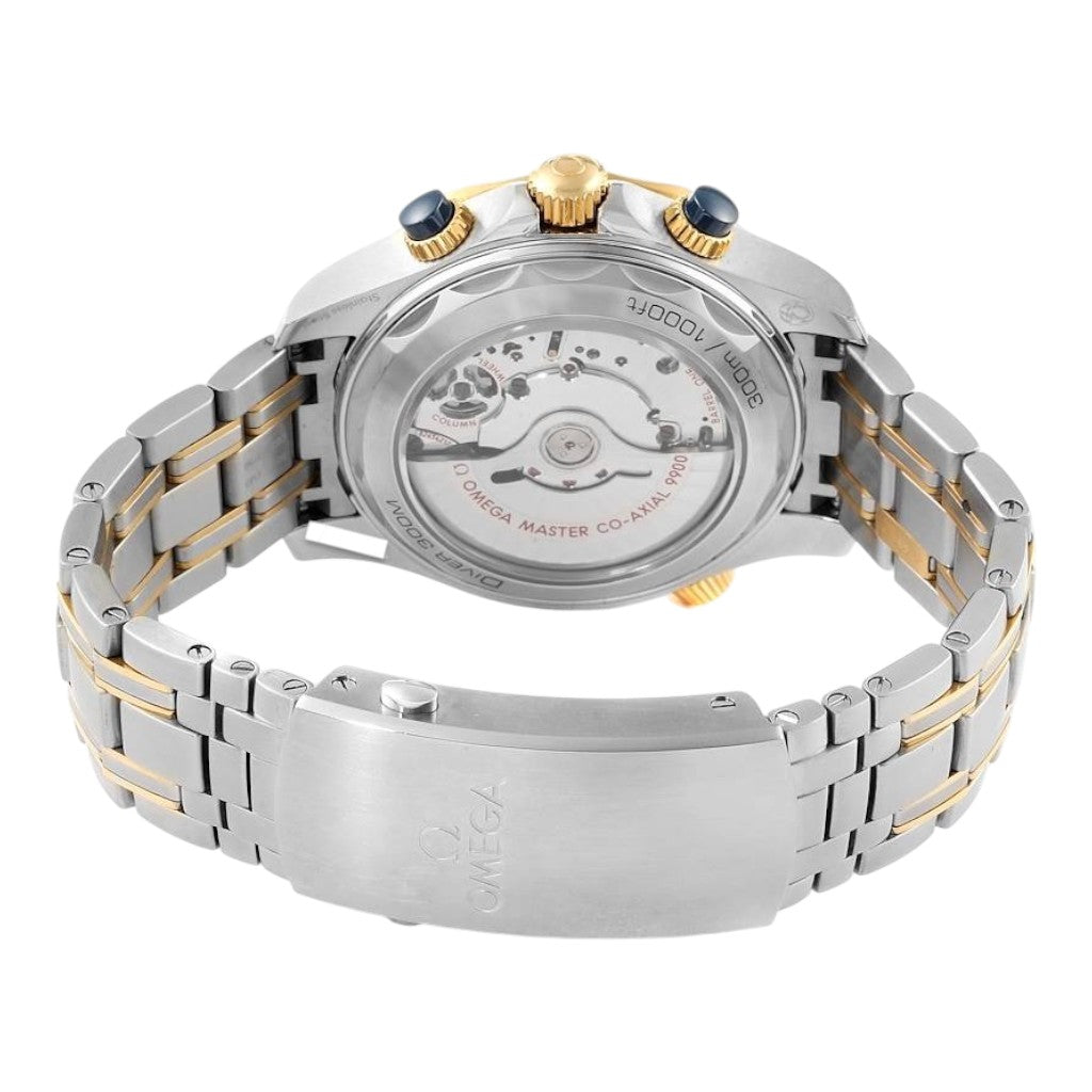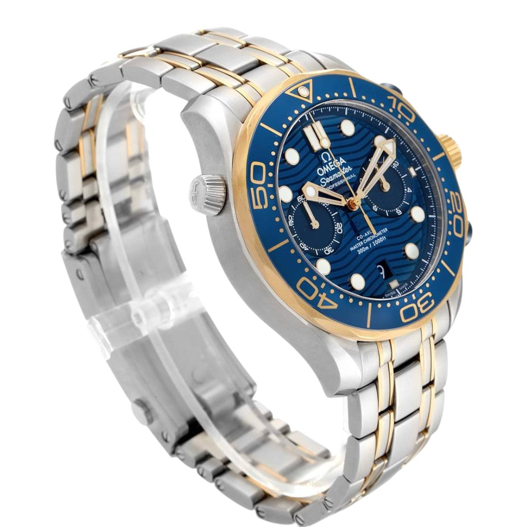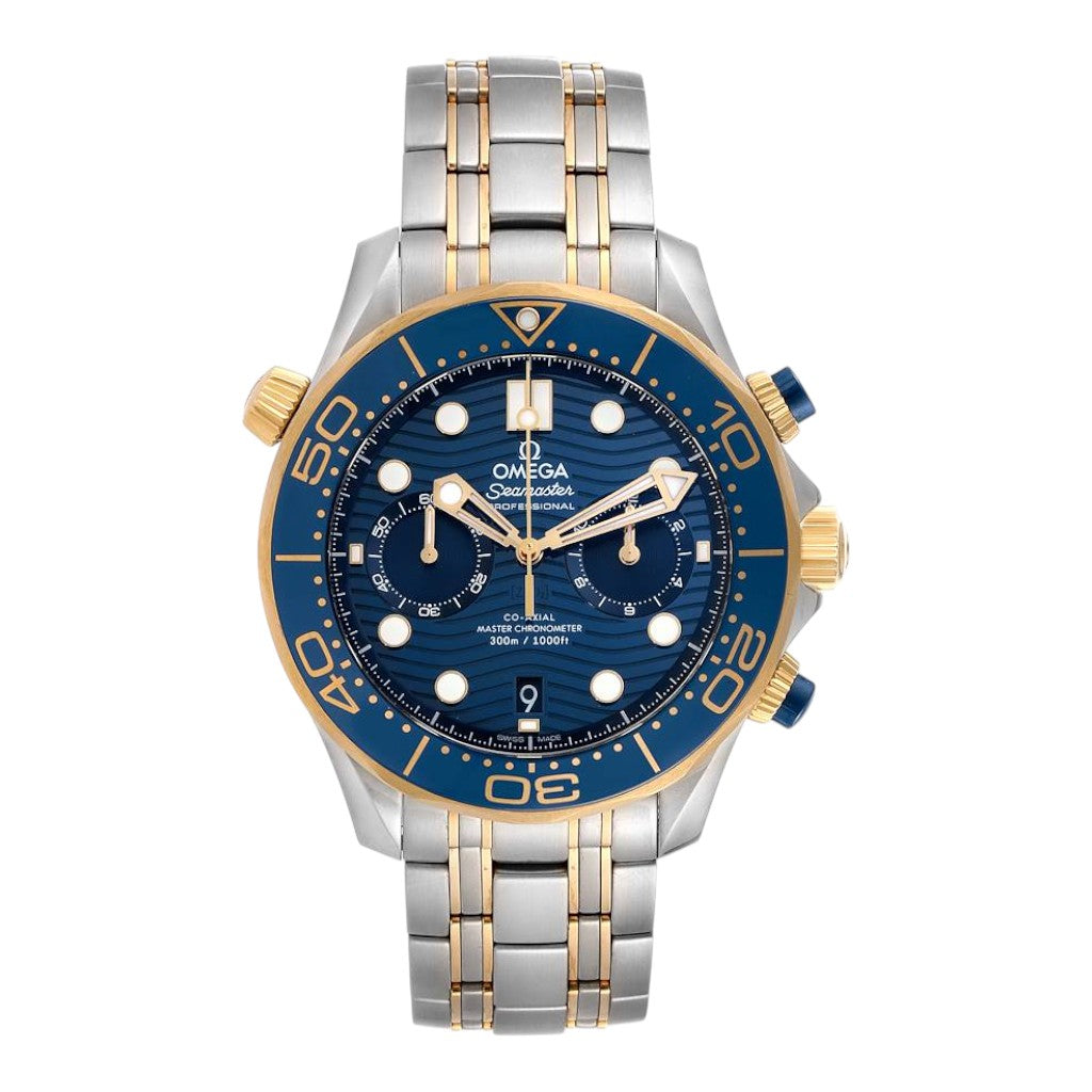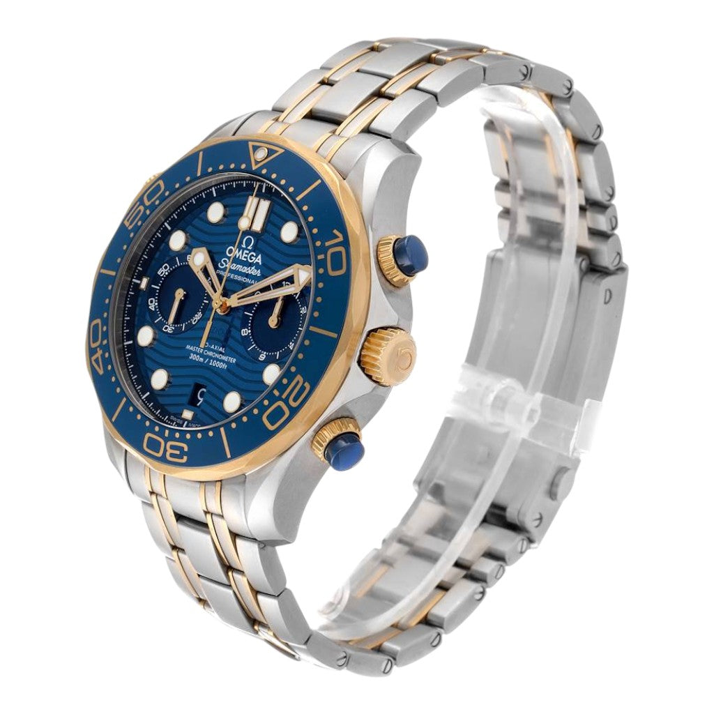The striking blue ceramic dial is laser-engraved with the signature wave pattern, a hallmark of the Diver 300M collection. Skeletonised Sedna™ gold hands and applied hour markers are filled with Super-LumiNova, ensuring excellent legibility in low-light and underwater conditions. Chronograph sub-dials are harmoniously integrated, while the discreet date display adds everyday practicality.