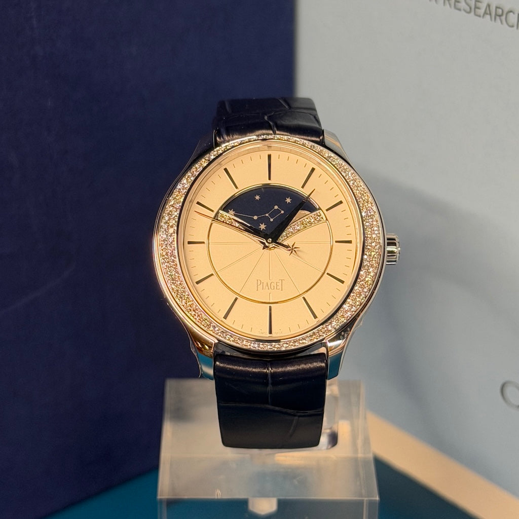 At the heart of the watch is the automatic Piaget Manufacture calibre 584P, visible through the sapphire crystal caseback. This in-house movement offers reliable performance and a power reserve of approximately 42 hours.