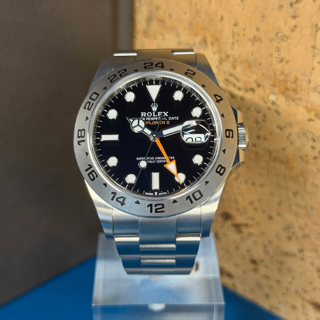 Built for those who venture into the unknown, the Rolex Explorer II 226570 is a rugged and reliable tool watch designed to thrive in the most demanding environments. This certified pre-owned 2023 model features the bold black dial variant, is offered in very good condition, and comes as a full set with its original box, warranty card, and documentation.