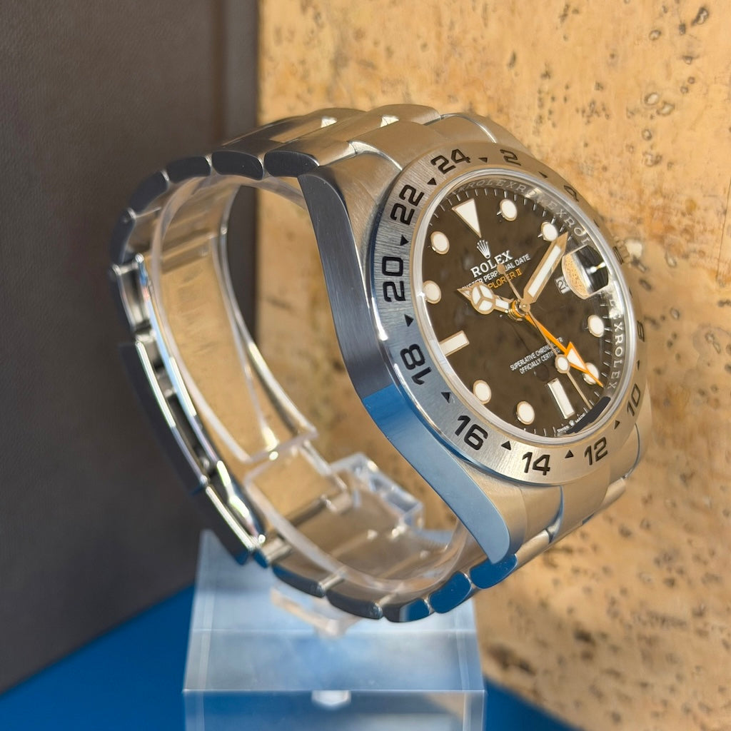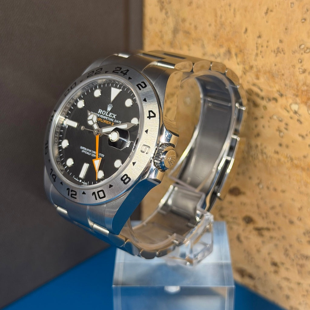 Powering the Explorer II is the Rolex calibre 3285, a state-of-the-art automatic movement with a 70-hour power reserve, Parachrom hairspring, and Chronergy escapement. Certified Superlative Chronometer, it guarantees outstanding precision, shock resistance, and magnetic field protection.