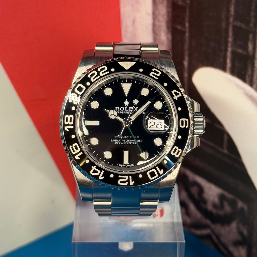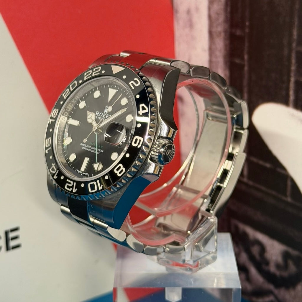 Fitted on the classic Oyster bracelet with polished center links and an Oysterlock clasp, the GMT-Master II 116710LN delivers both comfort and sporty elegance.