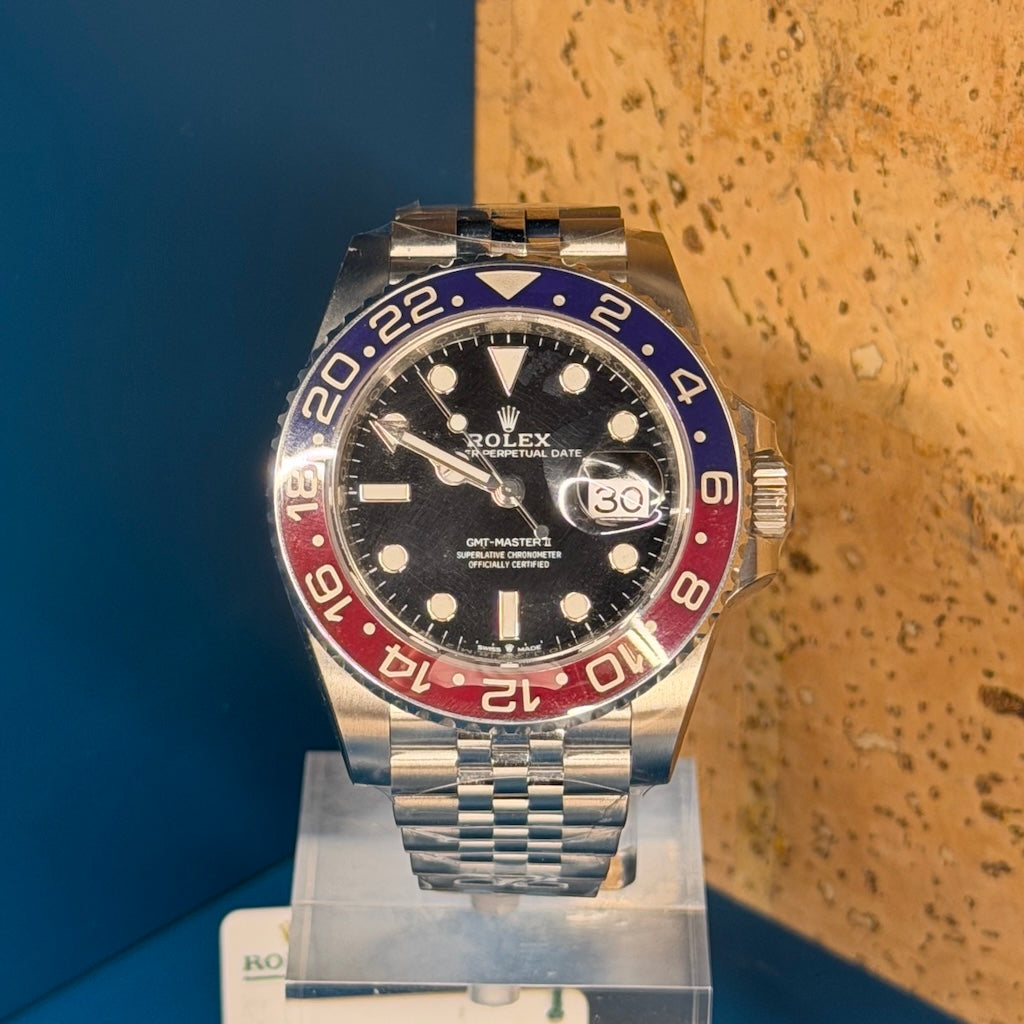 Featuring the distinctive blue and red Cerachrom bezel, known as the “Pepsi” insert, this watch pays tribute to the original GMT-Master models. The 40mm Oystersteel case is complemented by the Jubilee bracelet, offering both comfort and elegance.