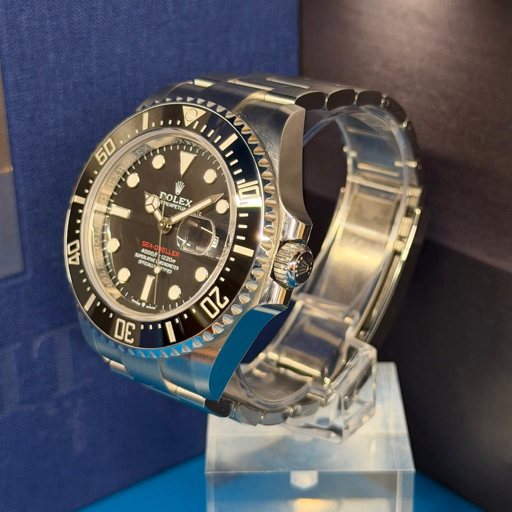 Crafted in Oystersteel, the 43 mm case features a black Cerachrom bezel with platinum-coated numerals, a sapphire crystal with the iconic Cyclops lens over the date—seen for the first time on a Sea-Dweller—and a striking red “Sea-Dweller” text on the dial, a direct nod to the original 1967 model.