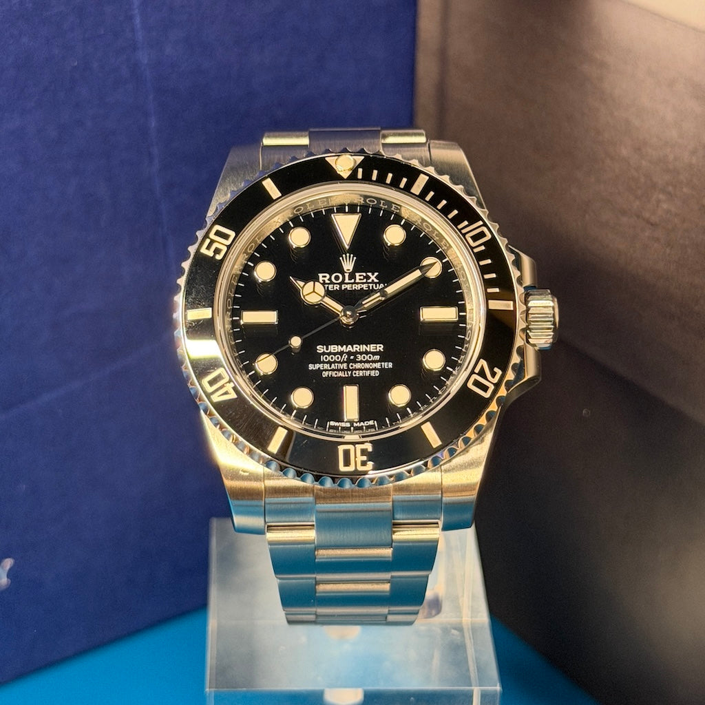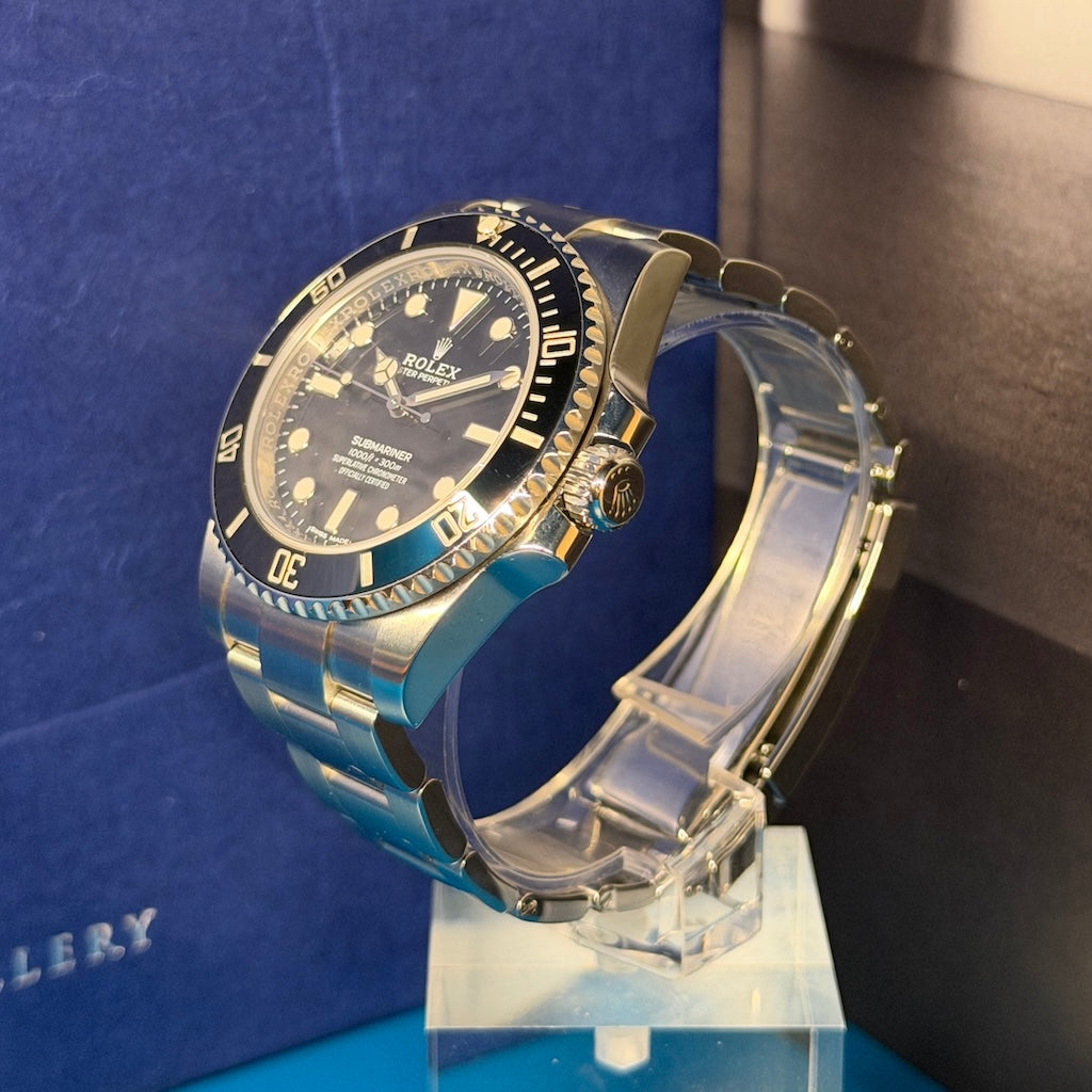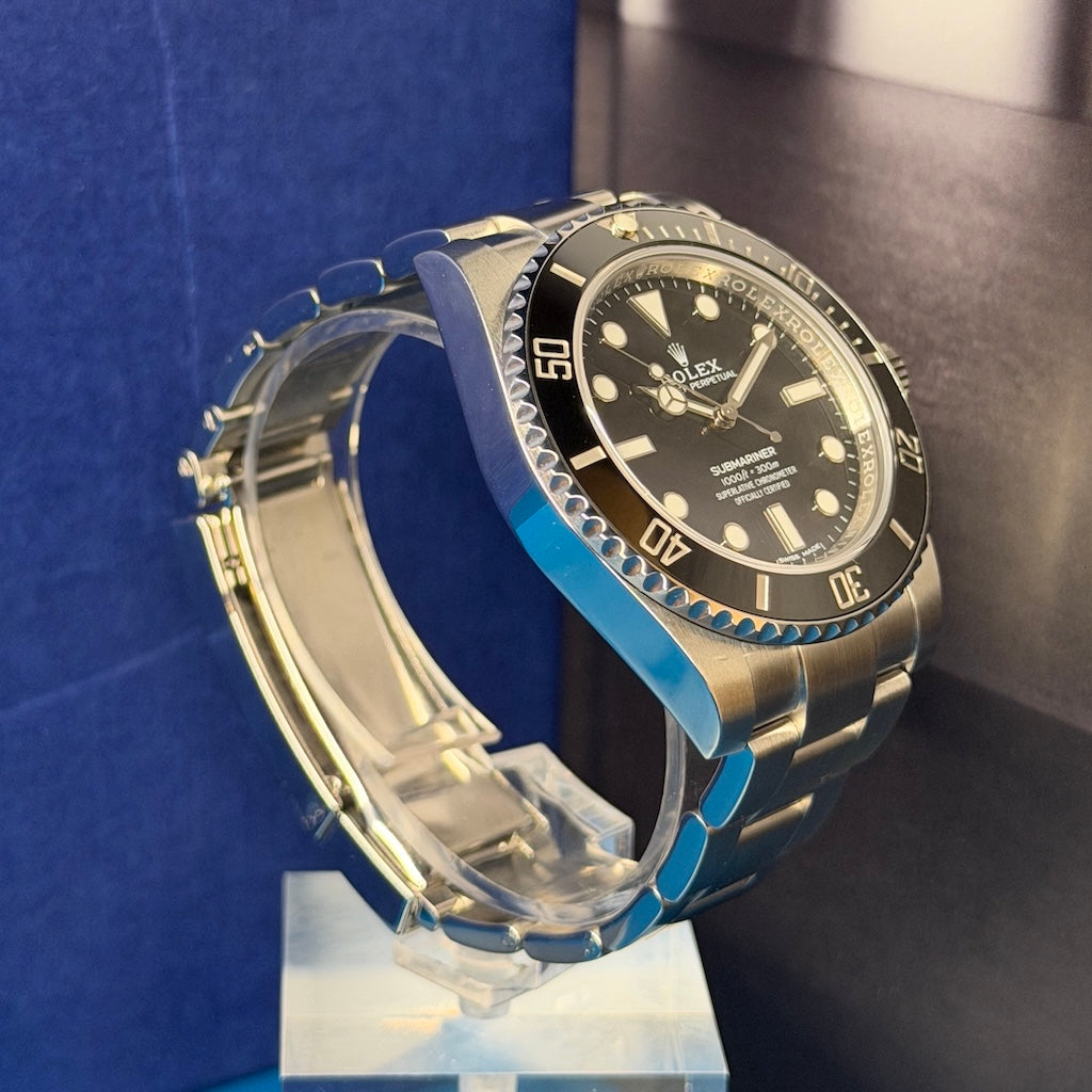 The Rolex Submariner No-Date, reference 114060, represents the purest expression of the legendary Submariner lineage. This 2018 model is offered as a certified pre-owned Rolex, presented in excellent condition, and delivered with its full original set, including box, warranty card, and manuals.
