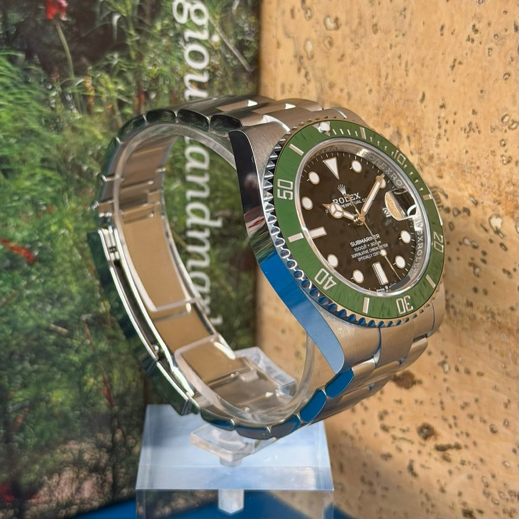 Crafted in Oystersteel, the watch features a 41mm case paired with a striking green Cerachrom ceramic bezel insert and a deep black dial. The contrast between the vibrant green bezel and the black dial creates a bold yet perfectly balanced aesthetic.