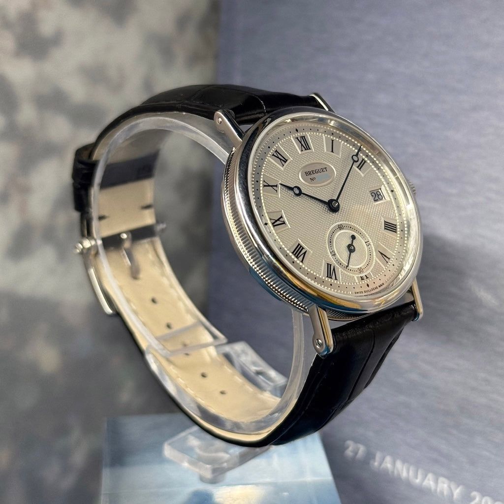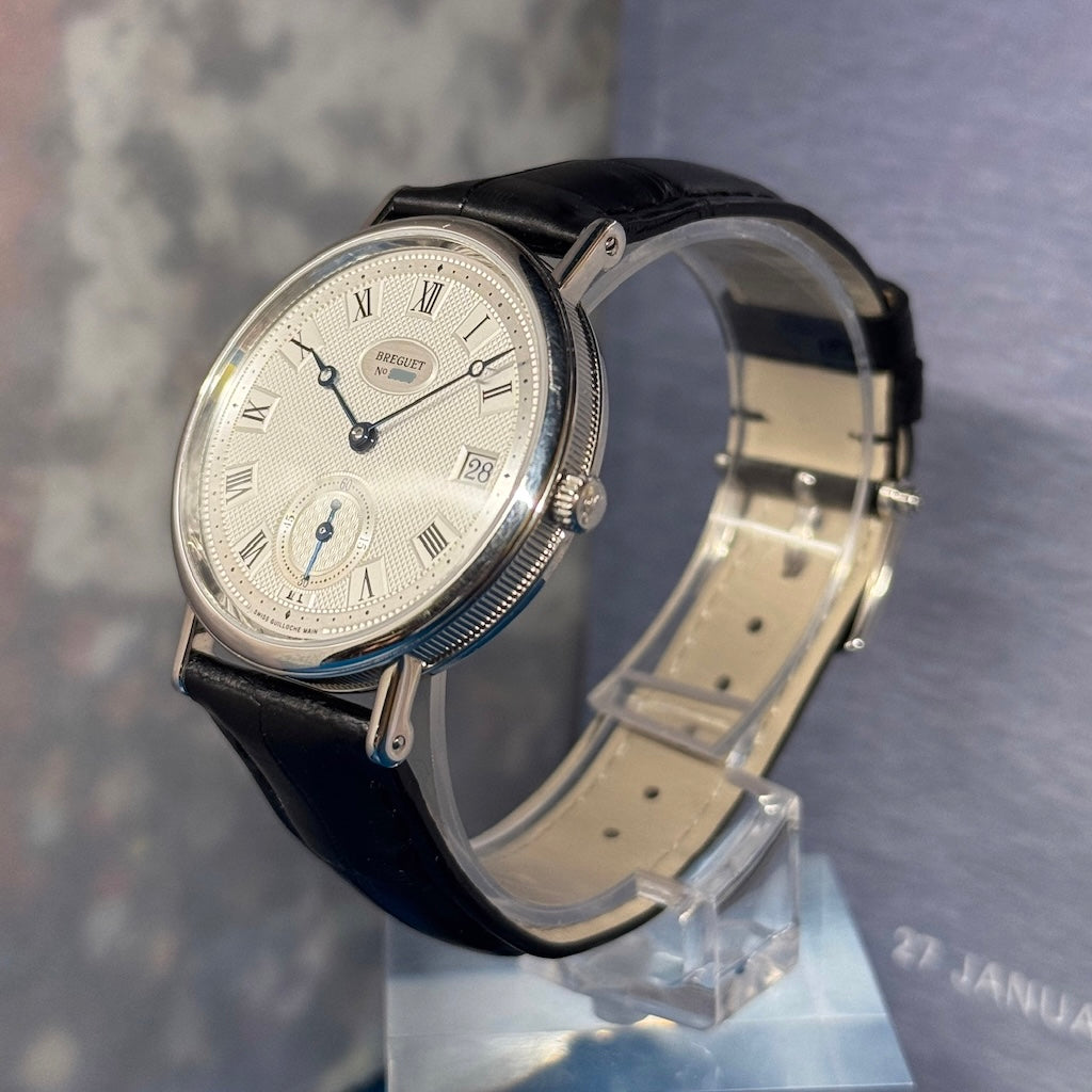 Le cadran arbore une petite seconde à 6h, entourée d’un chemin de fer des minutes et de chiffres Breguet subtilement inclinés, offrant un équilibre visuel parfait. À l’intérieur, le calibre automatique Breguet 516DR, décoré avec soin, assure une excellente précision et un confort d’utilisation moderne.