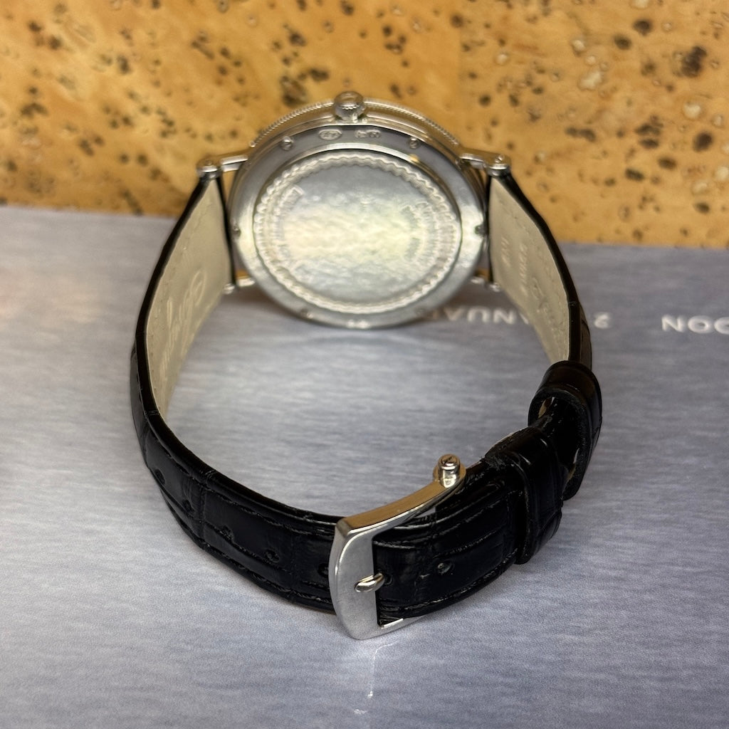Montée sur un bracelet en cuir de qualité avec boucle ardillon, cette montre reflète une esthétique sobre et noble, fidèle à l’esprit des grandes montres de poche Breguet, transposée à une montre-bracelet élégante et discrète.