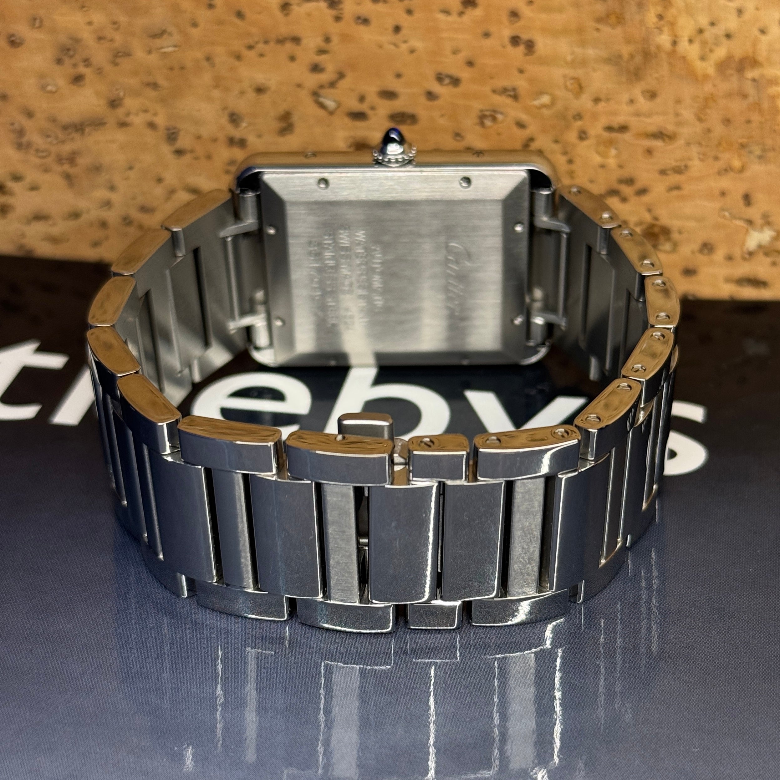 Son boîtier en acier inoxydable de 31 x 41 mm, au format large, reprend les lignes emblématiques de la Tank : forme rectangulaire, cornes intégrées, et couronne perlée ornée d’un cabochon bleu saphir. Les proportions généreuses mais élégantes en font un choix idéal pour les poignets masculins ou pour les femmes recherchant un modèle affirmé.