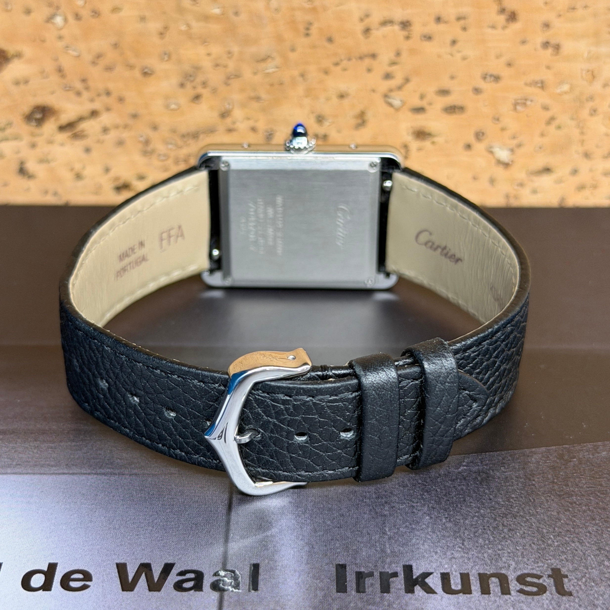 Mounted on a black calfskin leather strap with a Cartier signature pin buckle, this watch combines comfort and understated elegance. Its versatile design is equally suited to formal attire and more casual styles.