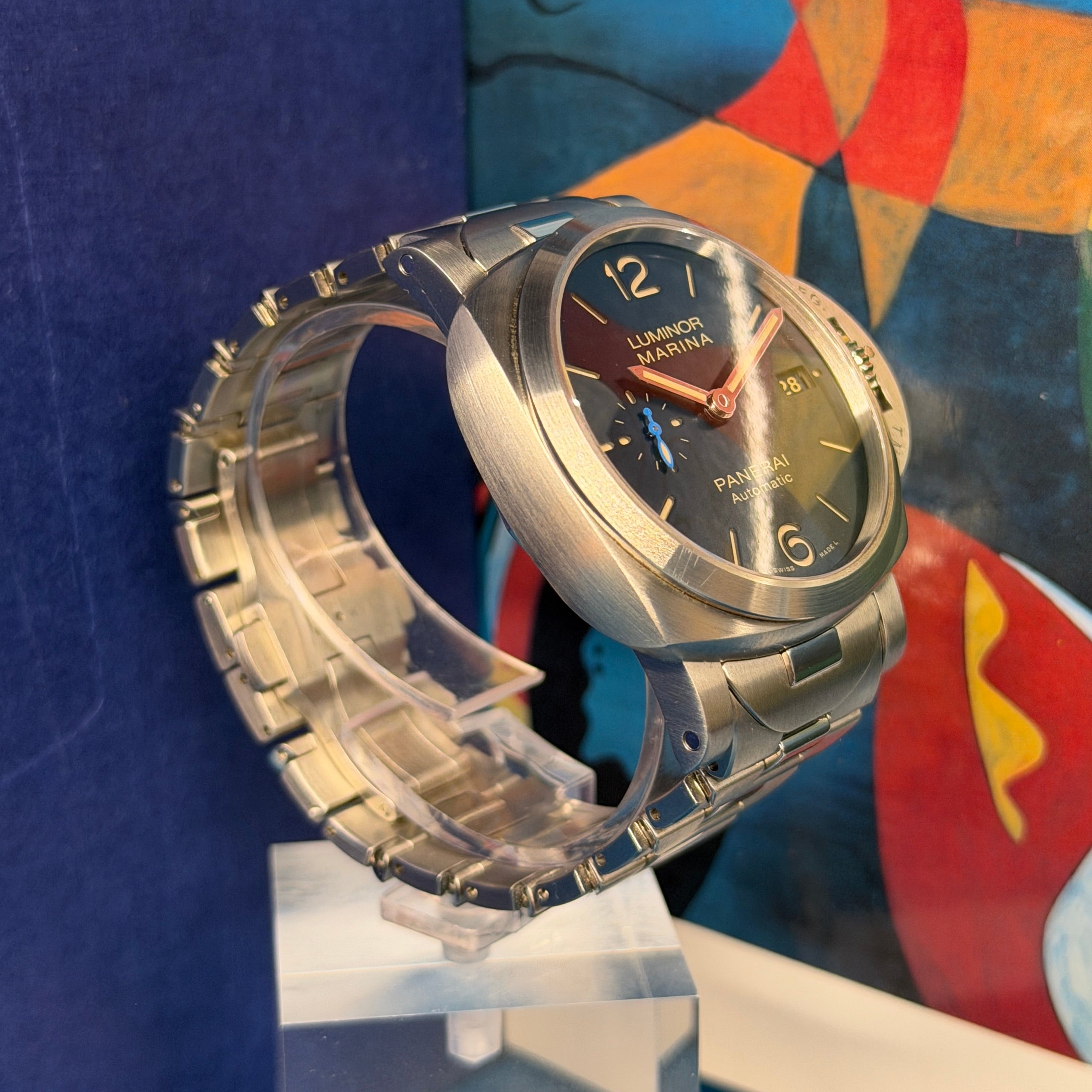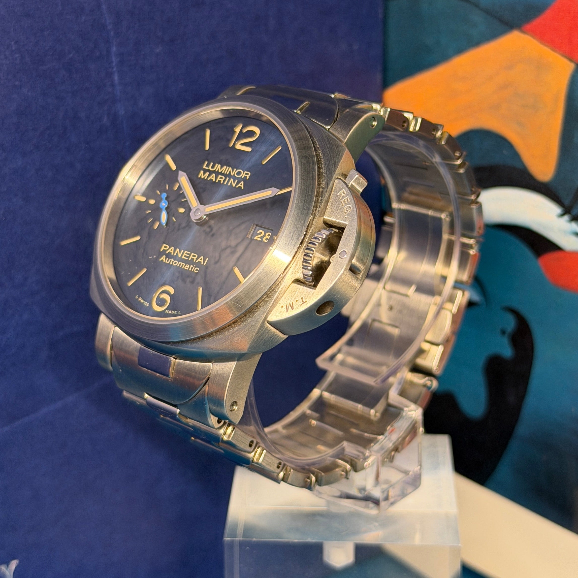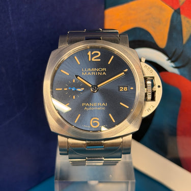 Its 42mm polished steel case incorporates the iconic Luminor design elements: the cushion shape, the crown protected by the famous bridge, and a commanding presence on the wrist. All of this is complemented by a sumptuous sunburst satin-finished blue dial, whose reflections shift with the light, enhanced by the brand's signature luminescent hour markers and Arabic numerals.