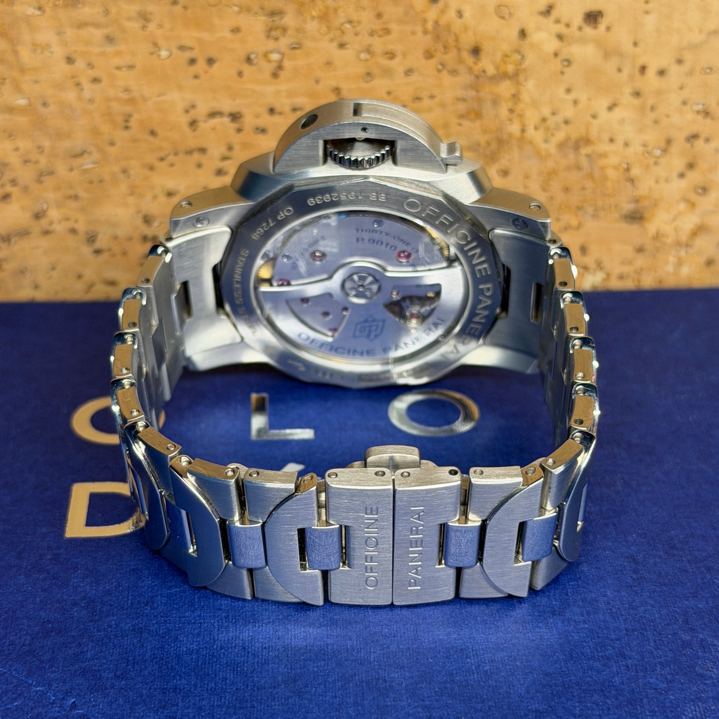 Powered by the Panerai P.9010 automatic caliber, the watch boasts a 72-hour power reserve, a stop-seconds function, and independent time setting, all visible through a transparent sapphire crystal case back.