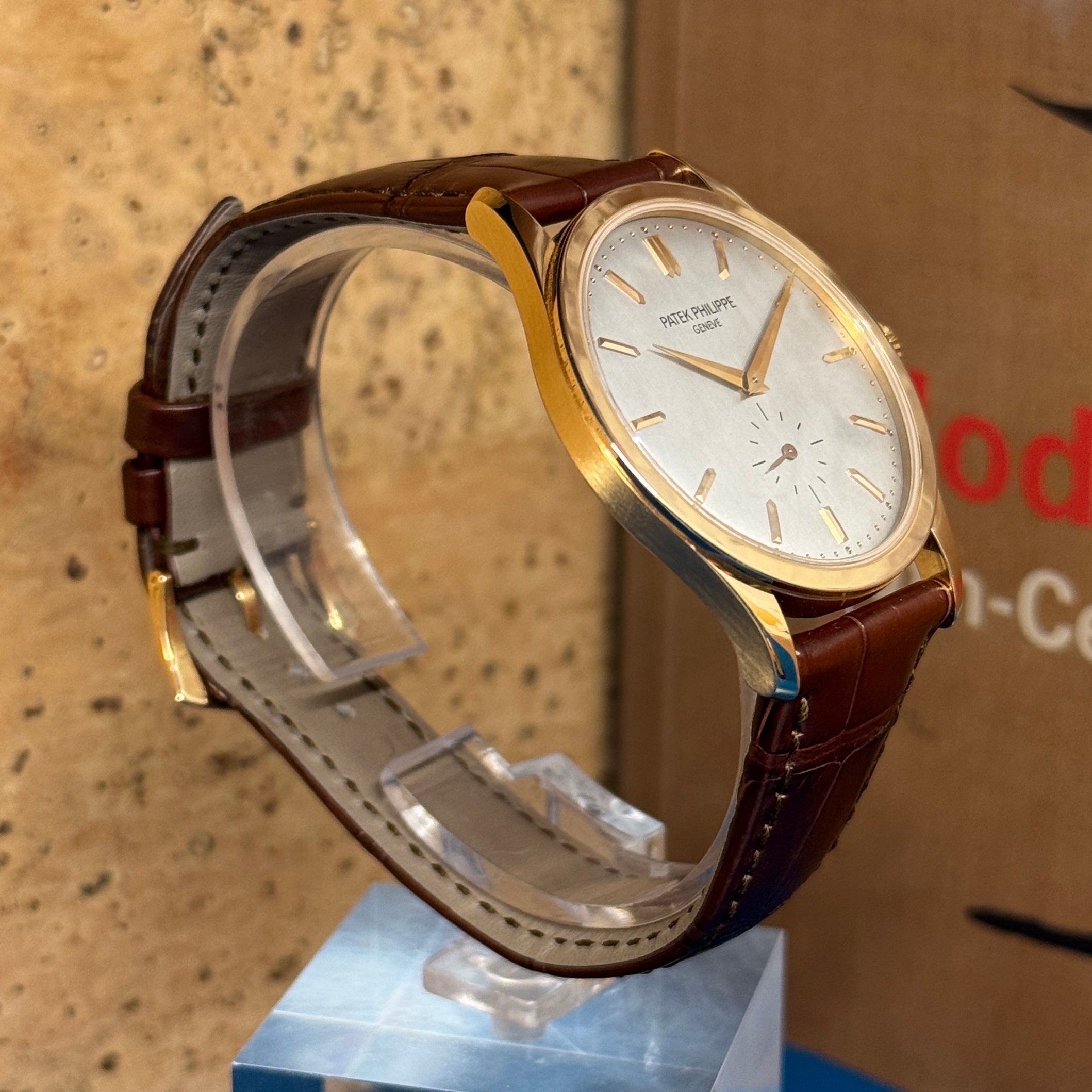 Son boîtier en or rose 18 carats de 37 mm, aux lignes pures et au profil ultra fin, exprime un raffinement sobre et mesuré, parfaitement adapté à une tenue habillée. Le cadran argenté opalin, minimaliste, est agrémenté d’index bâtons appliqués en or et d’aiguilles dauphines fines et élégantes. Aucun guichet date ne vient perturber l’harmonie visuelle — un choix assumé, fidèle à l’ADN puriste de la collection Calatrava.