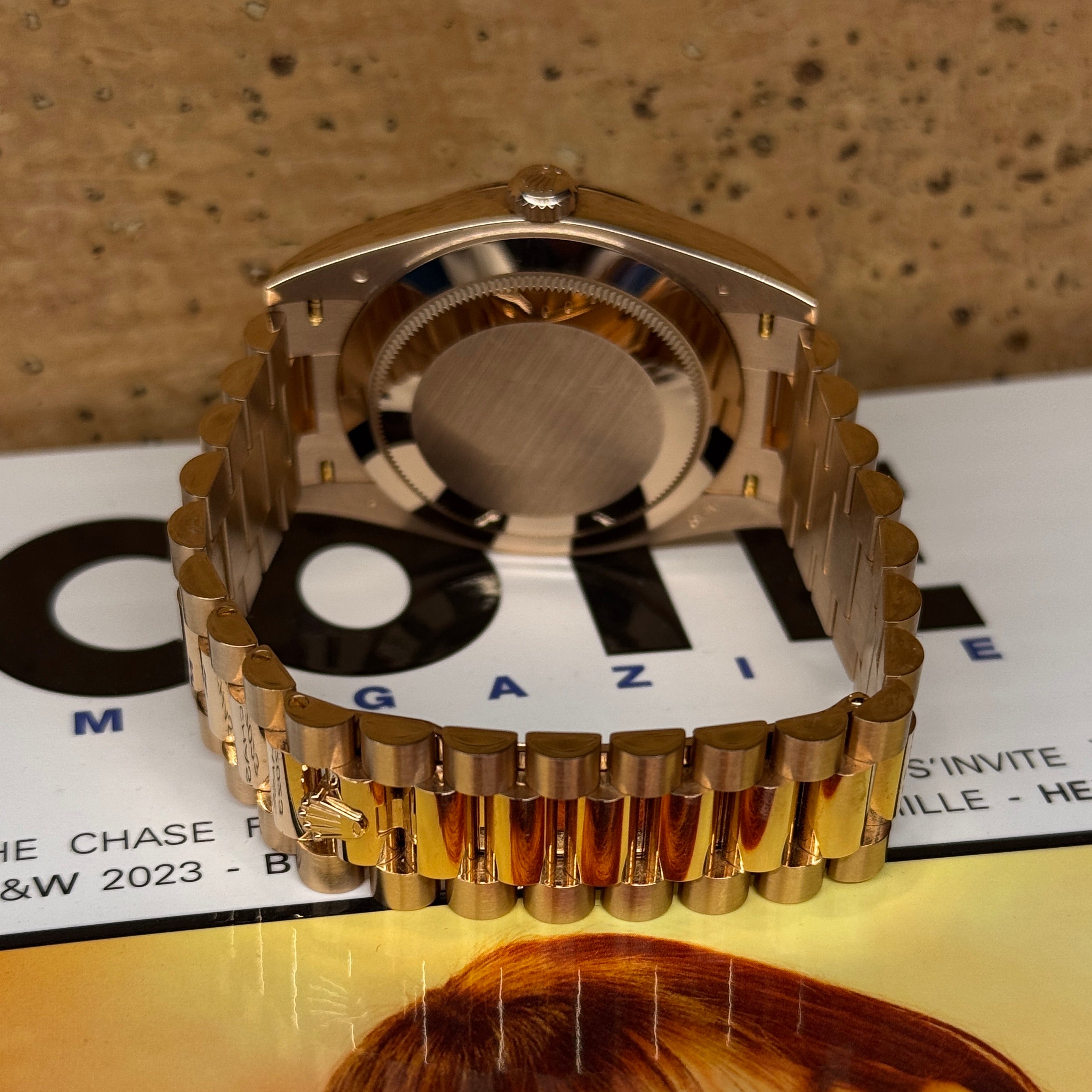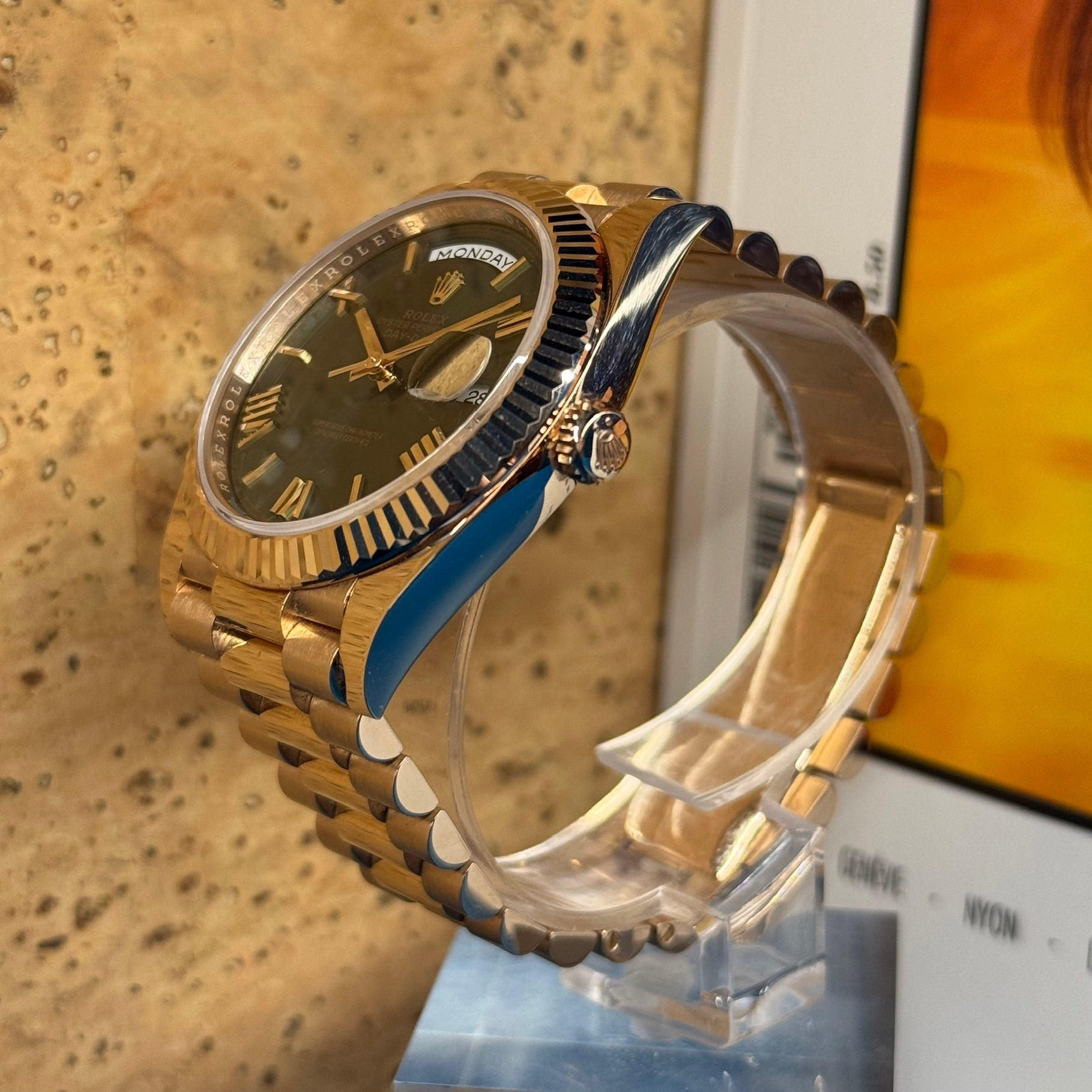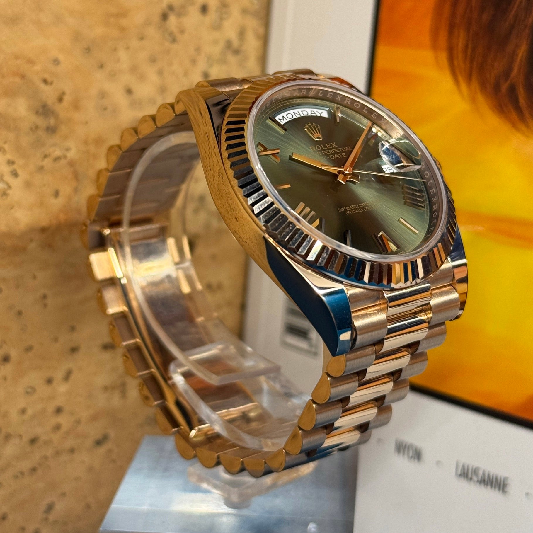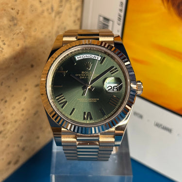 Available in Geneva, this Rolex Day-Date 40 Olive is a piece of character, both refined, timeless and sought after — a sure value in any exceptional watchmaking universe.