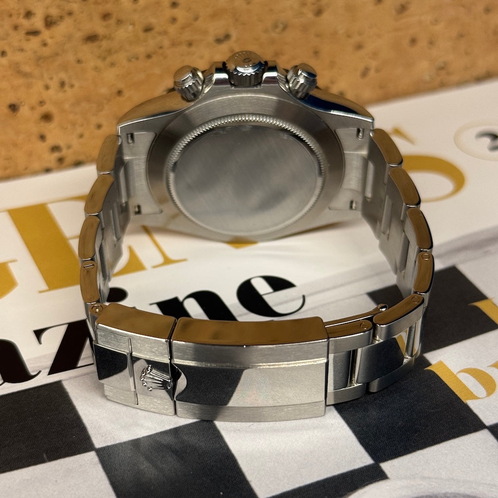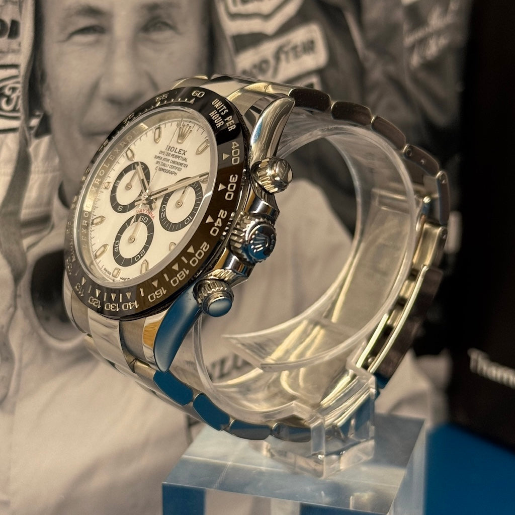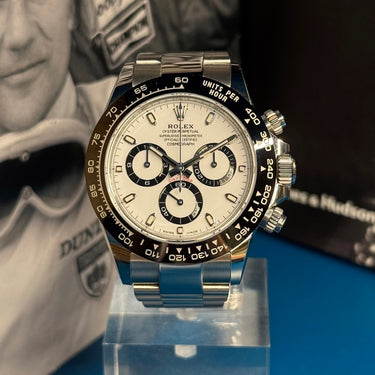 Son boîtier de 40 mm en acier Oystersteel s’accompagne d’une lunette Cerachrom noire en céramique, ultra résistante aux rayures et à la décoloration. Le cadran blanc laqué, rehaussé de compteurs noirs, rappelle l’esthétique des chronographes de course vintage, d’où le surnom “Panda”. Les index appliqués et les aiguilles chromées sont remplis de Chromalight pour une excellente lisibilité, de jour comme de nuit.